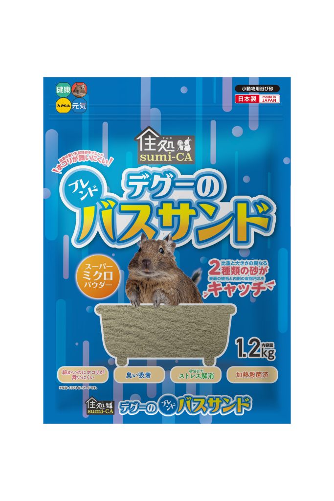 ダブルコート構造をしているデグーの被毛には毛の根元まで入り込みやすい目が細かいパウダータイプの砂が理想的です。