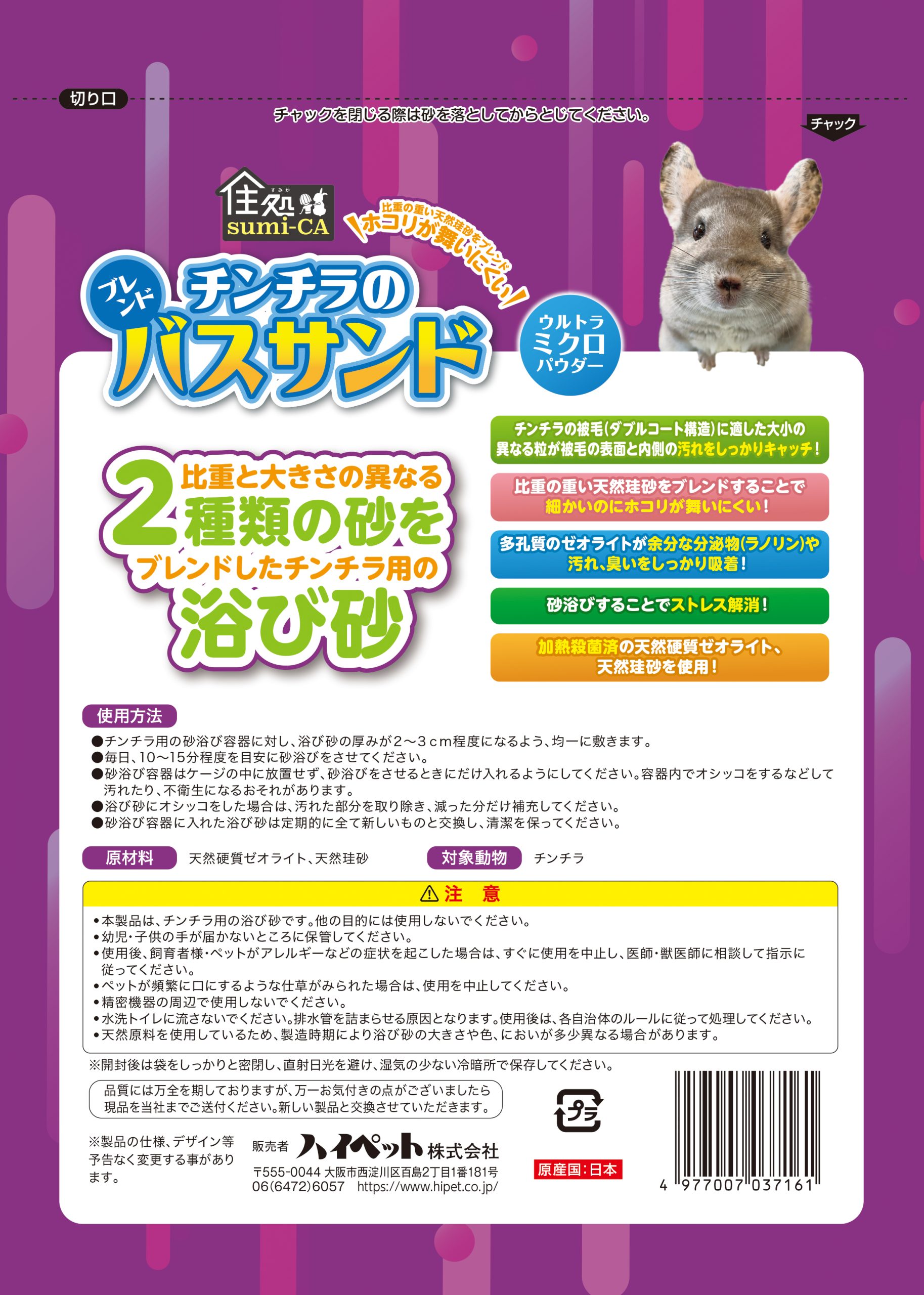 チンチラのブレンドバスサンド 細かいのにホコリが舞いにくい 臭いの吸着 ストレス解消 加熱殺菌済 比重と大きさの異なる2種類の砂をブレンドし、被毛の汚れと砂の舞い上がりに配慮した浴び砂 チンチラの被毛に適した大小の異なる粒が被毛の表面と内側の汚れをしっかりキャッチ。 比重の重い天然珪砂をブレンドすることで、細かいのにホコリが舞いにくい。 多孔質のゼオライトが皮脂の汚れや臭いを吸着。 砂を掘ることでストレス解消。 加熱殺菌済みの天然ゼオライト、天然珪砂使用。 安全安心な日本製。 基本情報 用途 小動物用浴び砂 対象動物 チンチラ 内容量 1.2kg 原産国 日本 希望小売価格 オープン 商品サイズ W200×H280×D35mm JANコード 4977007037161 原材料・素材 天然硬質ゼオライト、天然珪砂 関連商品 ハムスターのブレンドバスサンド デグーのブレンドバスサンド